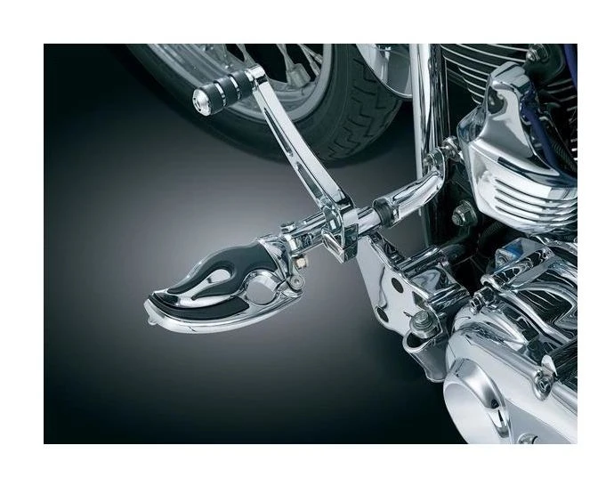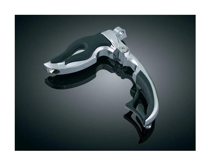 The flame design adds class and a timeless style to your bike. Designed with a flip-out arm for use as a heel rest that adds comfort on long rides and folds away when not needed. Features chrome bodies and rubber pad inserts that isolate the foot from vibration. The built-in curb-feeler hits the ground before your pegs do. The Flame pegs are available with late model H-D male-mount ends. Matching Shift Pegs and Brake Pedals also available separately.