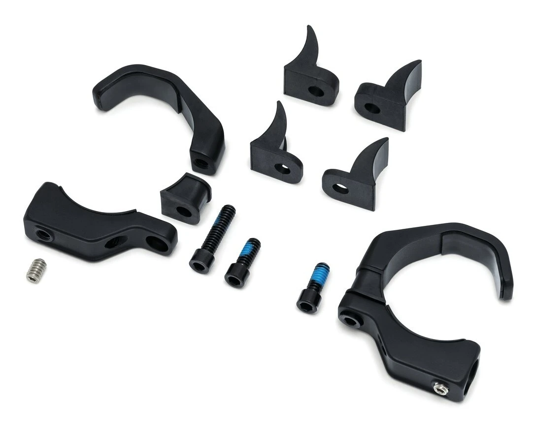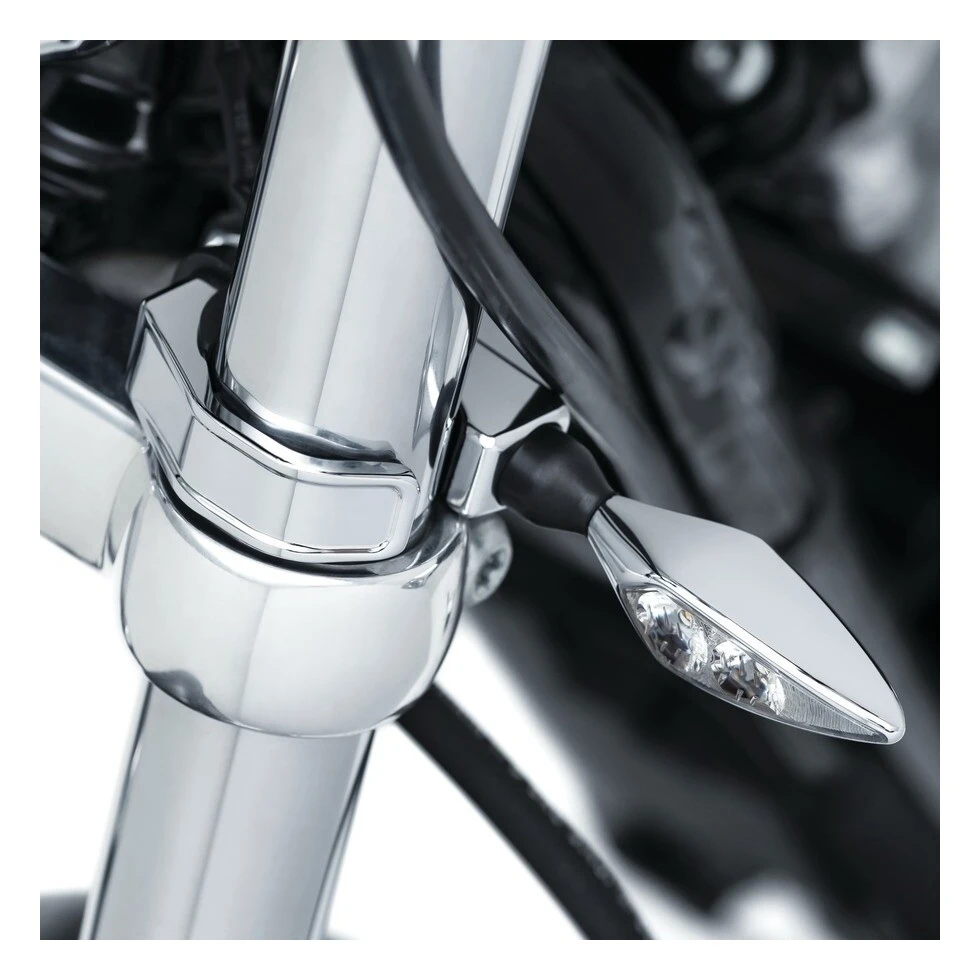 Kuryakyn Fork Mounts ease the process of installing fork-mounted turn signals. The unique clamping system adjusts to fit 39mm up to 49mm fork tubes and accepts any aftermarket turn signals using an M8-1.25 threaded stud.