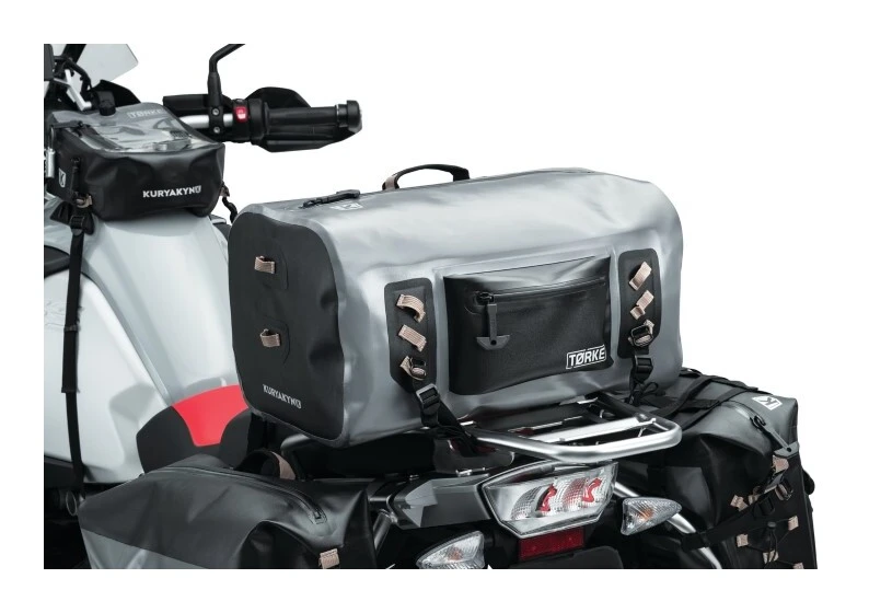 The 35 liter Torke Dry Bag Duffle is a side-loading dry bag with full-length waterproof zipper. A universal fitting kit is included and should provide an easy installation on most motorcycles. The Torke Dry Bag Duffle includes a removable cargo net for additional cargo carrying ability. A removable, padded shoulder strap makes for easy transport when off the bike.