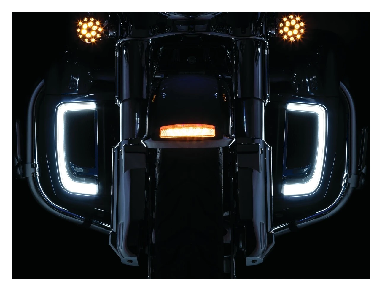 These fairing lower grills are intense, fully diffused L.E.D. lights with full-time white running lights and amber switchback turn signals when activated. Significantly enhance your front end’s styling and visibility toward oncoming motorists with these direct snap-in replacements for the black plastic radiator grills or filler plates on late-model H-D fairing lowers.